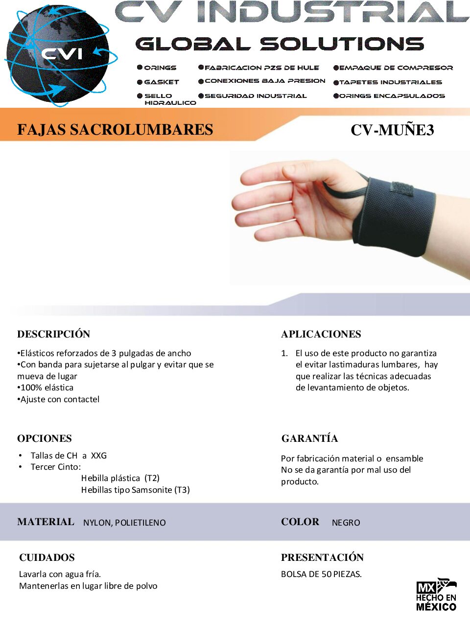 Elástico de 3 pulgadas reforzado. Sujeta en el dedo pulgar. Ambidiestro.